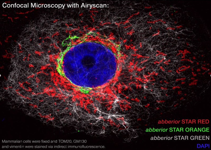 Fluorofory Abberior STAR byly vyvinuty speciálně pro konfokální a super-rezoluční mikroskopii, kde poskytují vysoký jas, nízké pozadí signálu a velmi dobrý poměr signálu k šumu. Díky tomu jsou vhodné pro náročné experimenty s vícebarevným značením.