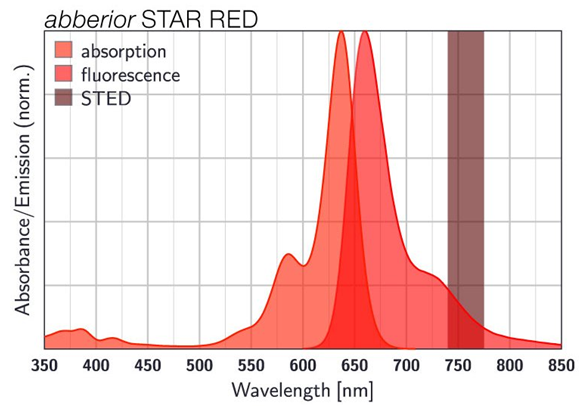 V kombinaci s fluoroforem Abberior STAR RED poskytuje ideální spektrální pár pro multiplexní a dvoubarevné STED zobrazování.