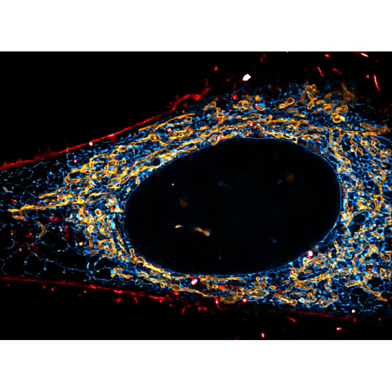 Abberior CELL LINE, Mito-SNAP / ER-Halo je geneticky modifikovaná buněčná linie osteosarkomu odvozená od lidské mateřské buněčné linie U2OS. Byla vyvinuta tak, aby obsahovala SNAP-Tag v genu specifickém pro mitochondrie a Halo-Tag v genu specifickém pro ER, což umožňuje dvoubarevnou vizualizaci obou organel v živých buňkách. Vzhledem k tomu, že abberior CELL, Organelle 2-Color si zachovává vlastnosti mateřské buněčné linie U2OS, včetně vysoké genetické stability a snadné kultivace, systém SNAP-Halo-Tag umožňuje uživatelům selektivně a rychle značit mitochondrie a ER. Tato buněčná linie byla důkladně testována a je vysoce kompatibilní s sondami abberior LIVE (ligandy SNAP, Halo, HaloX) a přímými značkami (aktin, tubulin, DNA, Mito, membrána), díky čemuž je vhodná pro přesné a efektivní barvení v aplikacích zobrazování živých buněk. Výsledkem je, že tato buněčná linie poskytuje robustní platformu pro zobrazování organel v reálném čase jak za normálních, tak za chorobných podmínek, čímž významně přispívá k základnímu výzkumu a aplikovaným biomedicínským studiím. Podrobné pokyny týkající se vlastností, manipulace a skladování naleznete v našem produktovém listu.