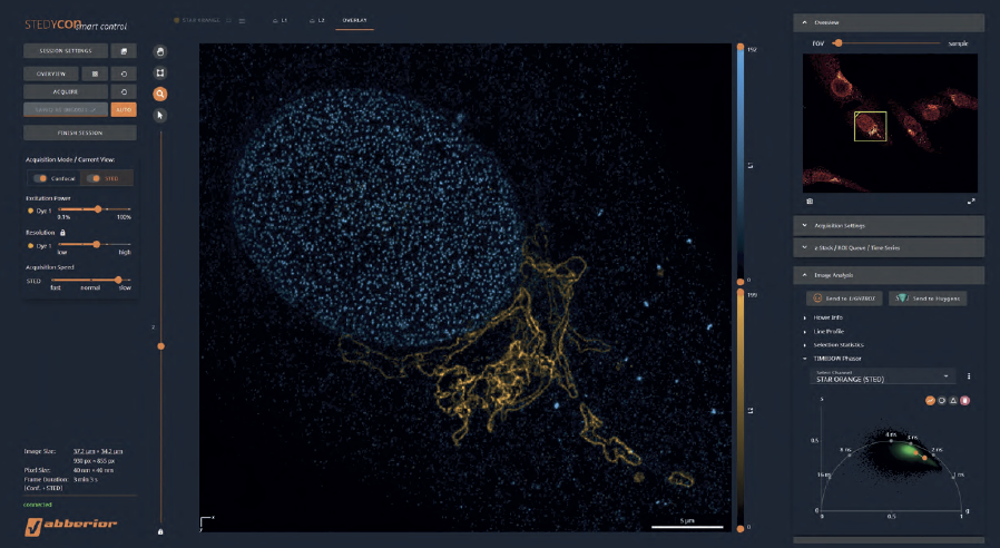 Plánujete provádět rutinní zobrazování za účelem kontroly zavedených markerů? Provádíte složité mikroskopické experimenty za účelem řešení náročných výzkumných otázek? Inteligentní ovládání STEDYCON vám to vše umožní.