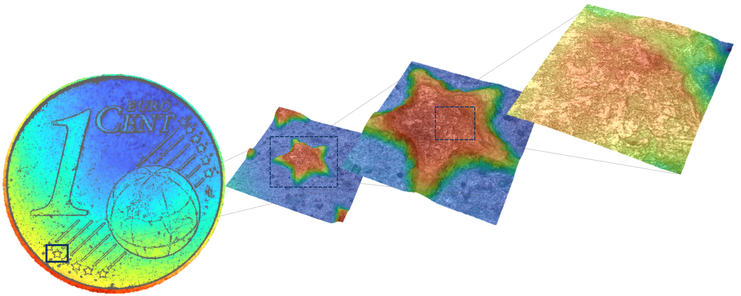 Focus Variation Mikroskopie (FVM) Vhodná pro zachycení makroskopického tvaru vzorku. Kombinací FVM s LSM nebo WLI umožňuje získání tvaru od makroskopických komponent po mikrostruktury. |