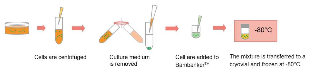 Médium pro zmrazování buněk Bambanker™ umožňuje kryokonzervaci buněk při teplotě -80 °C (nebo v tekutém dusíku), čímž odpadá potřeba dalšího a drahého ultranízkého mrazáku a odpadají časově náročné a komplikované protokoly řízeného zmrazování. Stačí (1) odebrat buňky, (2) odsát médium, (3) resuspendovat v přípravku Bambanker™ (4) přenést do kryovialu a (5) uložit při -80 °C. Není nutné žádné programované nebo sekvenční zmrazování! Bambanker™ je bezsérové kryokonzervační médium, které se dodává připravené k použití a lze jej uchovávat v chladničce až dva roky. K dispozici jsou pohodlné 20ml lahvičky, takže mrazicí médium Bambanker™ je ideální pro použití jednotlivými členy vaší laboratoře. Dnes je toto inovativní médium pro zmrazování buněk Bambanker™ lídrem na japonském trhu a vyznačuje se mnoha různými publikovanými články s velmi citlivými buněčnými liniemi po celém světě.