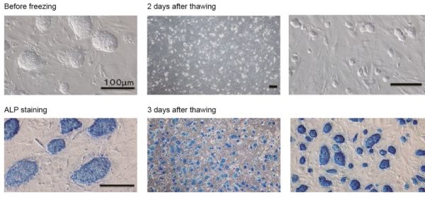 Životaschopnost buněk a barvení ALP pluripotentních kmenových buněk. Horní řada: Dva dny po rozmrazení je zjištěno velké množství buněk. Buňky nevykazují po rozmrazení žádné morfologické změny. Spodní řádek: Vlivem mrazení se na hladinu mléka a mléčných buněk objevují další změny: BambankerTM nezpůsobuje diferenciaci buněk, protože všechny zmrazené kmenové buňky stále produkují vysoké hladiny alkalické fosfatázy, což je reportér pluripotentních kmenových buněk.