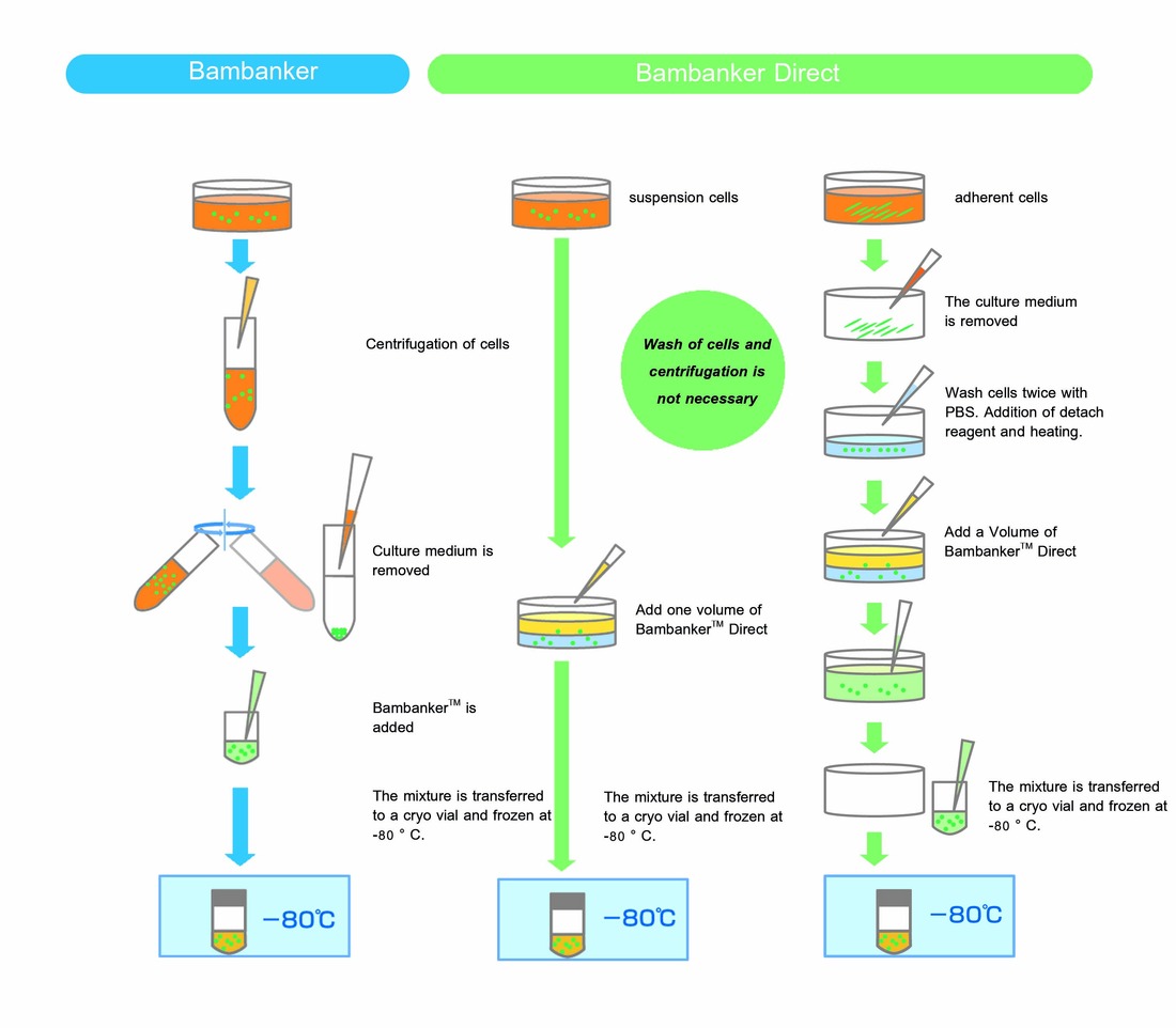 Existují určité typy buněk, například hybridomy, které vykazují zvýšenou citlivost na "nadměrnou" manipulaci. Tyto buňky často vykazují vyšší míru úmrtnosti nebo nežádoucí diferenciace po dlouhodobém skladování a cyklickém zmrazování a rozmrazování. Právě pro tyto typy buněk byl vytvořen přípravek Bambanker™ Direct - pro zajištění přísné kontroly prostředí. Díky odstranění kroku odstřeďování lze nyní buňky zmrazit pro dlouhodobé skladování ihned po přidání nového kryoprotektantu. Stačí přidat přípravek Bambanker™ Direct, jeden k jednomu, s buňkami v médiu a přímo umístit do mrazničky. Stejně jako u původního přípravku Bambanker™ neobsahuje verze Direct žádné sérum, takže se skvěle hodí pro buňky, u nichž může být problémem sérum živočišného původu.