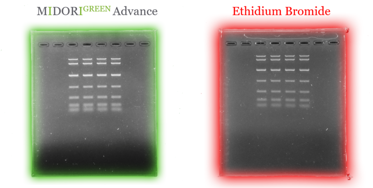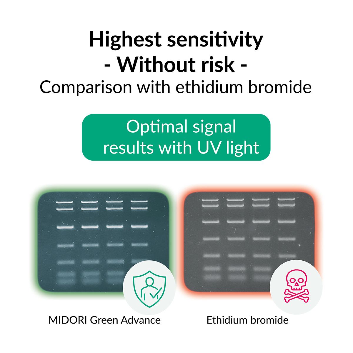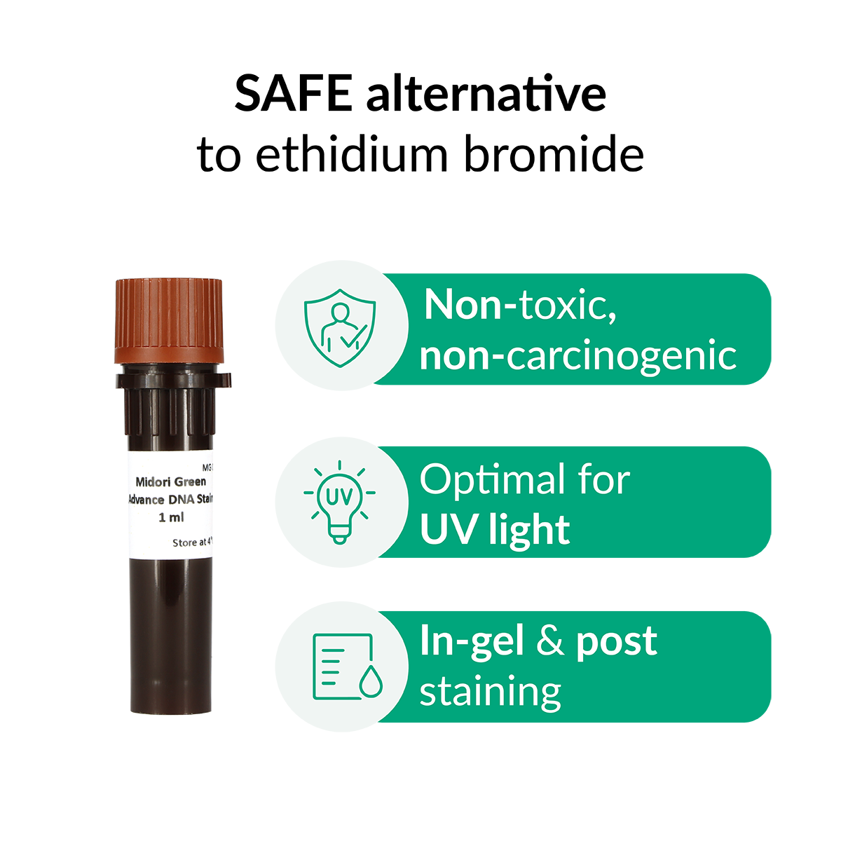 MIDORI Green Advance je bezpečnou alternativou tradičního barvení nukleových kyselin ethidium bromidem. Jedná se o nekarcinogenní a méně mutagenní barvivo pro detekci dsDNA, ssDNA a RNA v agarózových gelech s velmi vysokou citlivostí. MIDORI Green Advance lze využít s UV světlem nebo s naší inovativní technologií modrozelené LED.