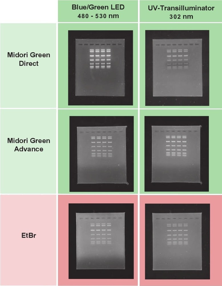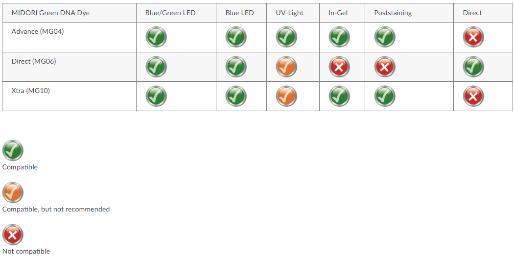 MIDORI Green Advance je kompatibilní se všemi běžnými světelnými zdroji: LED, modrou LED, modrou/zelenou LED. Stejně jako ethidium bromid lze i MIDORI Green Advance použít k barvení v gelu nebo po barvení.